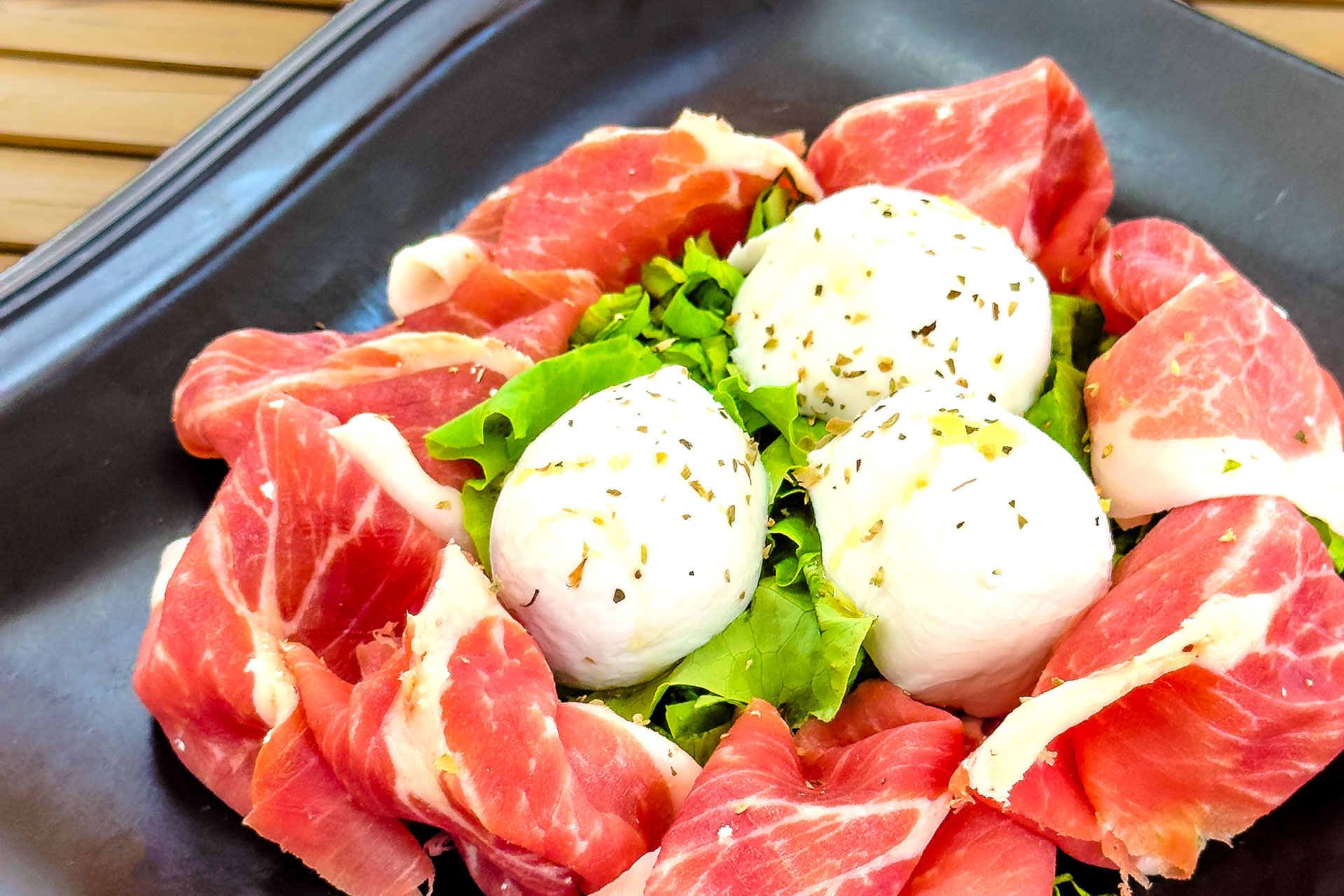 8-month aged parma cured ham, buffalo mozzarella, oregano, and lettuce